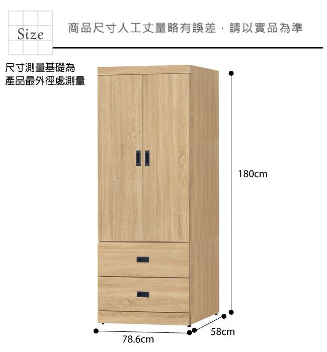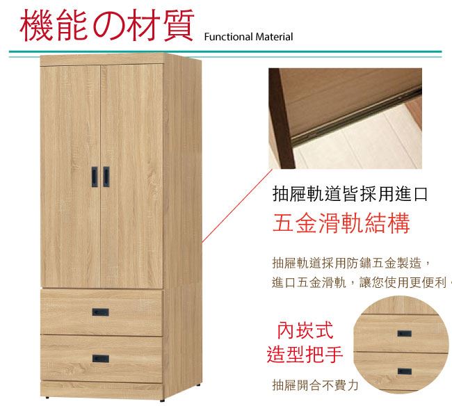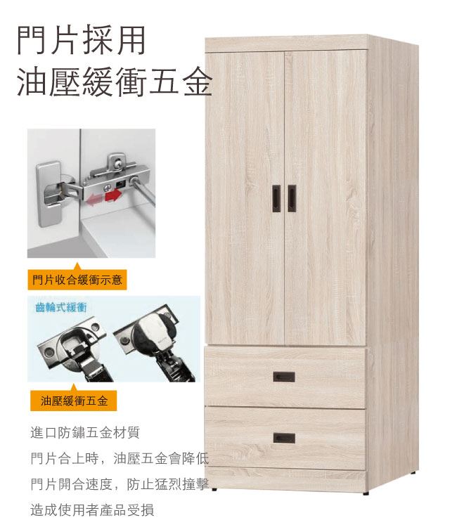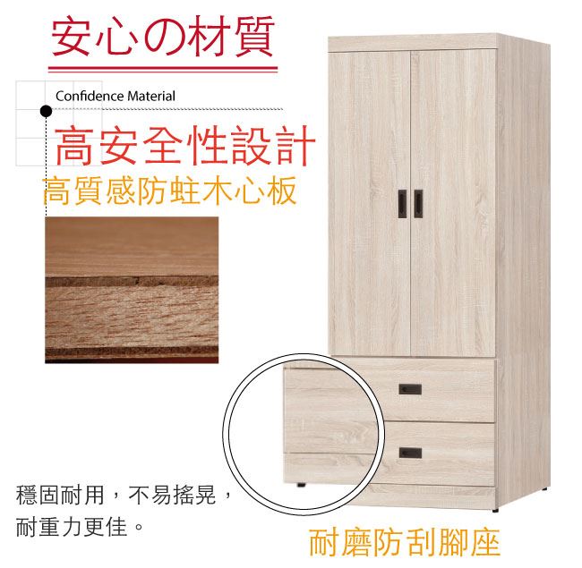 材質 | ◆產品名稱: 【綠家居】夏依 時尚2.6尺二門二抽衣櫃/收納櫃(四色可選) 尺寸:(寬)78.6x(深)58x(高)180公分 ◆材質: 材質:防蛀木心板+防潮耐磨腳座+五金滑軌結構+防夾手緩衝門片五金 外層採用全包式防潮耐磨噴漆處理