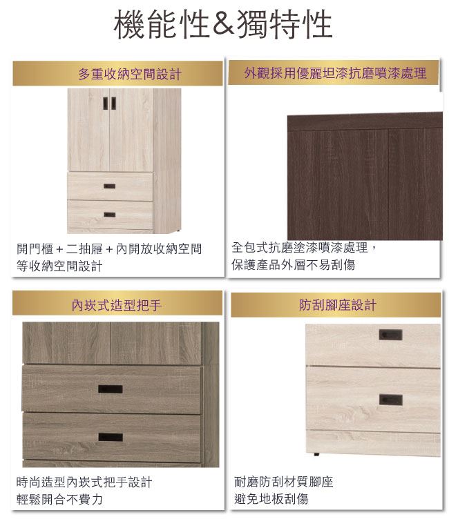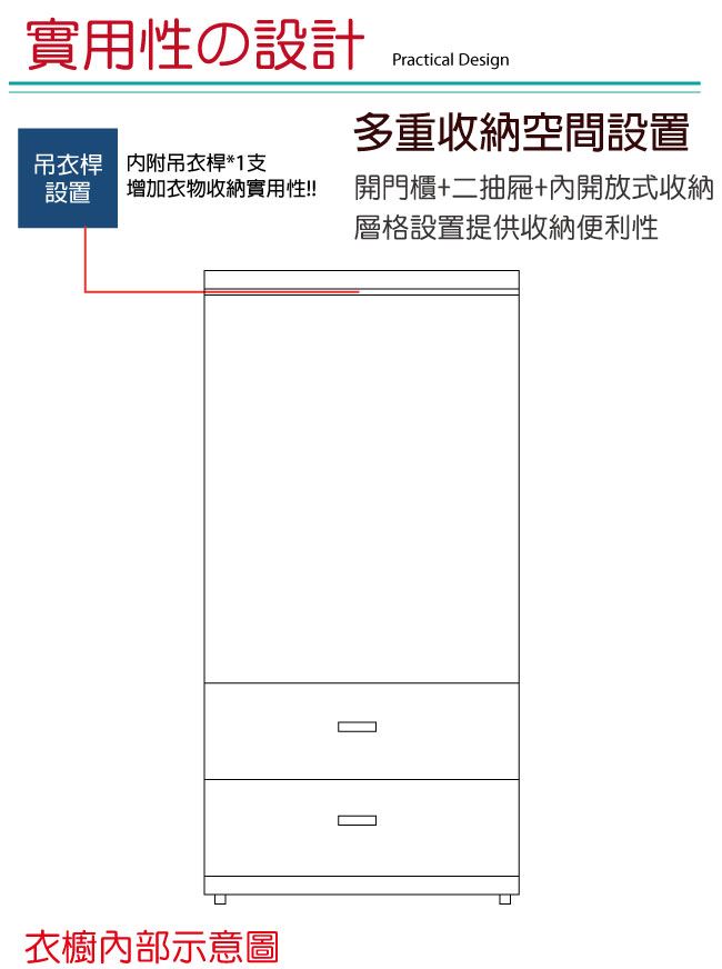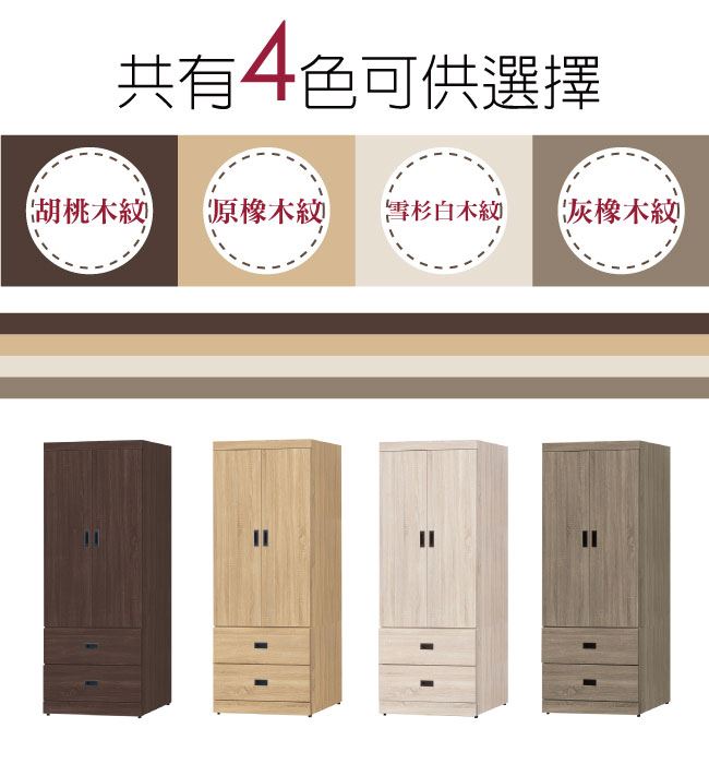 商 品 介 紹 | 【綠家居】夏依 時尚2.6尺二門二抽衣櫃/收納櫃(四色可選) 四色可選+現代簡約風格+安心材質製造,整體採用防蛀木心板+防潮耐磨腳座+五金滑軌結構+防夾手緩衝門片五金等安心材質製造,外層採用全包式防潮耐磨噴漆處理搭配採用開門櫃+吊衣桿+二抽屜+內開放式收納層格等收納空間設計,全由專人配送到家,專業安心服務,替你省下更多時間! 【商品特色】 四色可選+現代簡約風格+安心材質製造,使用放心+搭配居家更便利 採用防蛀木心板+防潮耐磨腳座+五金滑軌結構+防夾手緩衝門片五金等安心材質製造 採用開門櫃+吊衣桿+二抽屜+內開放式收納層格等收納空間設計 此商品不需要DIY組立,此商品為組立後之成品 品質保證、專業設計、貼心服務 全由專人配送到家,專業安心服務,替您省下更多時間 |