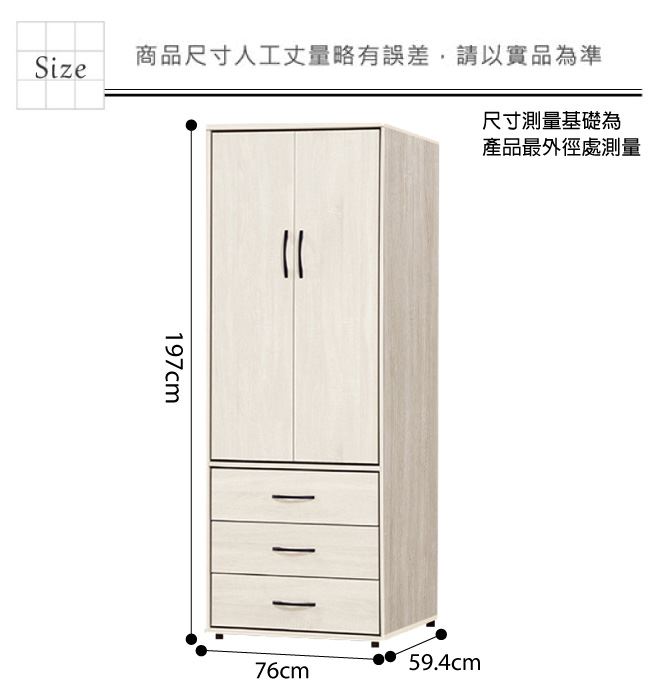 尺寸:(寬)76x(深)59.4(高)197/公分 ◆材質: 材質:防蛀木心板+防潮耐磨腳座+防夾手緩衝門片五金+五金滑軌結構 噴漆:防潮耐磨噴漆處理