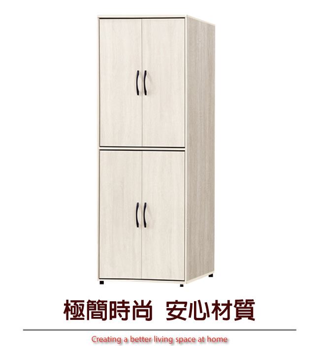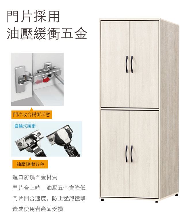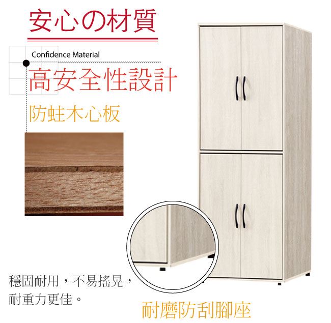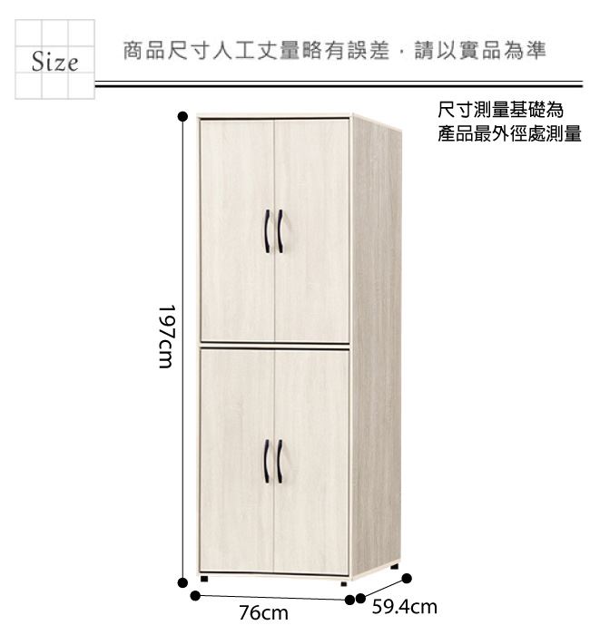 尺寸:(寬)76x(深)59.4(高)197/公分 ◆材質: 材質:防蛀木心板+防潮耐磨腳座+防夾手緩衝門片五金 噴漆:防潮耐磨噴漆處理