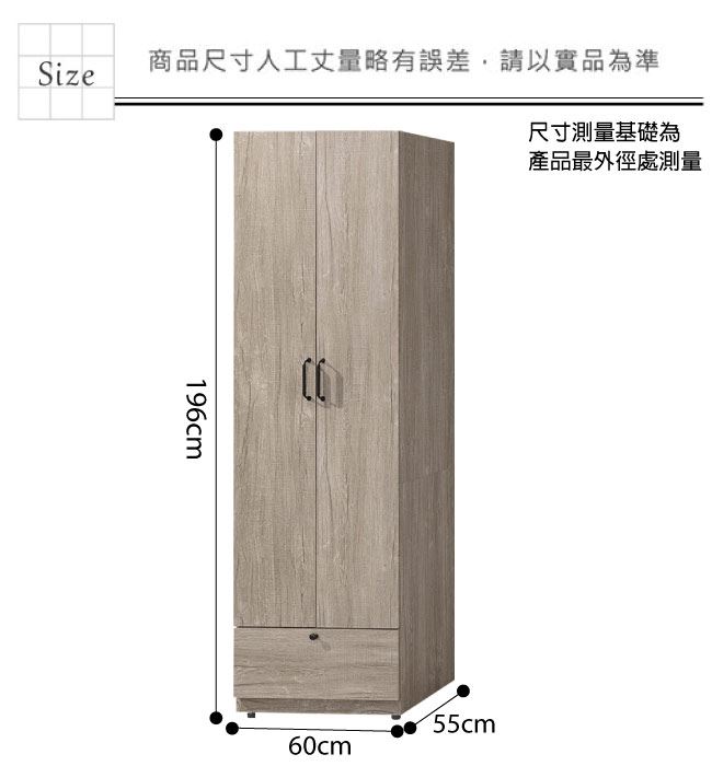 尺寸:(寬)60x(深)55(高)196公分 ◆材質: 材質:防蛀木心板+防潮耐磨腳座+防夾手緩衝門片五金+五金滑軌結構 噴漆:防潮耐磨噴漆處理