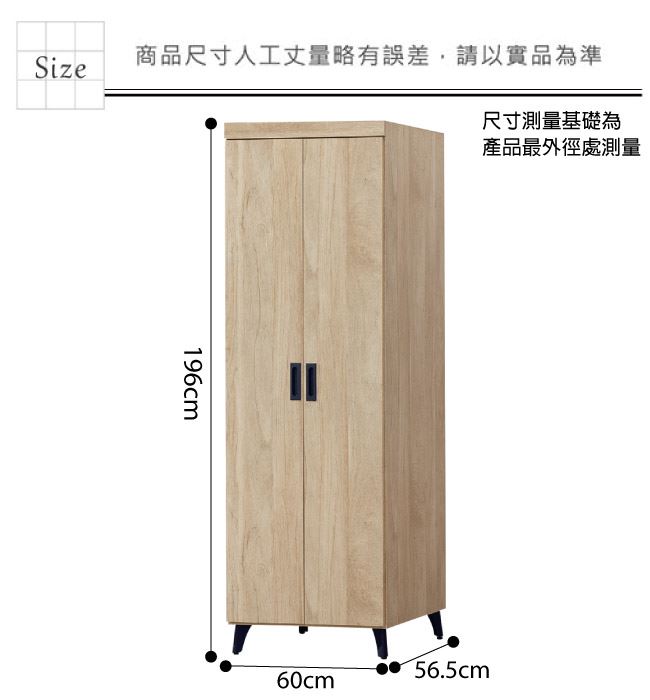 尺寸:(寬)60x(深)56.5(高)196/公分 ◆材質: 材質:防蛀木心板+防鏽黑漆腳座+防夾手緩衝門片五金 噴漆:防潮耐磨噴漆處理