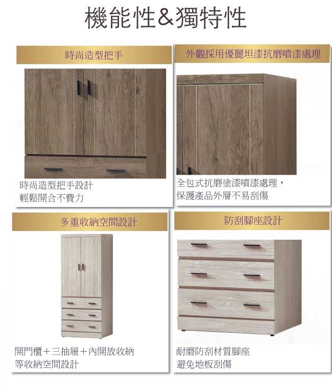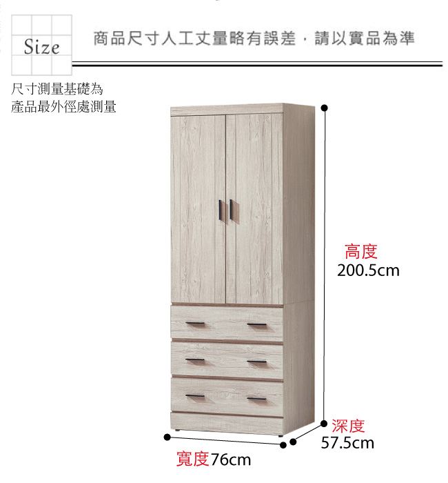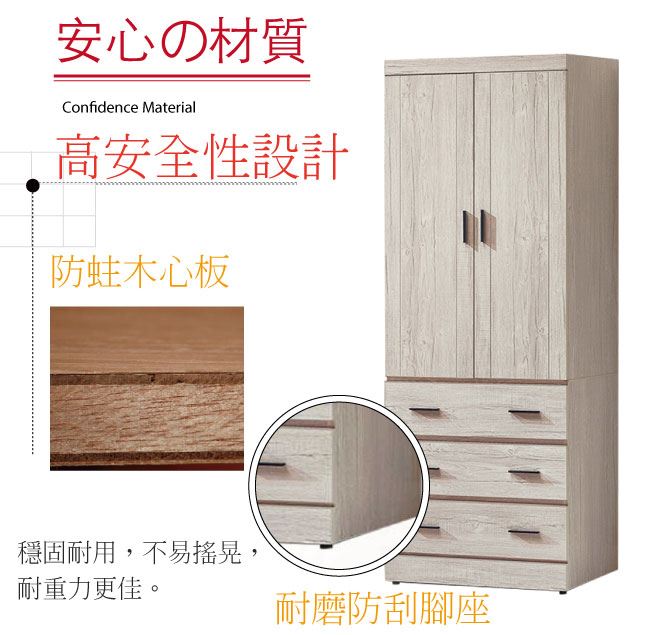 材質 | ◆產品名稱:【綠家居】卡地2.5尺二門三抽衣櫃(二色可選) 尺寸:(寬)76x(深)57.5(高)200.5/公分 ◆材質: 材質:防蛀木心板+防刮耐磨腳座+五金滑軌結構 噴漆:防潮耐磨噴漆處理