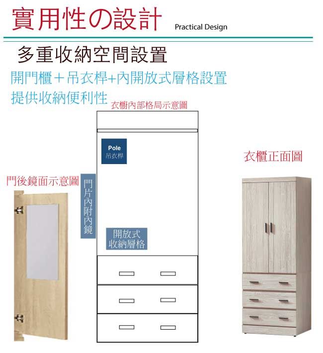 商 品 介 紹 | 【綠家居】卡地2.5尺二門三抽衣櫃(二色可選) 二色可選+現代簡約風格+安心材質製造,整體採用防蛀木心板+防刮耐磨腳座+五金滑軌結構等安心材質製造,產品外層採用防潮耐磨噴漆處理搭配採用三抽屜+吊衣桿+開門櫃+內開放式收納+內附門片式內鏡面等收納空間設計,全由專人配送到家,專業安心服務,替你省下更多時間! 【商品特色】 二色可選+現代簡約風格+安心材質製造,使用放心+搭配居家更便利 採用防蛀木心板+防刮耐磨腳座+五金滑軌結構等安心材質製造 產品外層採用防潮耐磨噴漆處理 搭配採用三抽屜+吊衣桿+開門櫃+內開放式收納+內附門片式內鏡面等收納空間設計 此商品不需要DIY組立,此商品為組立後之成品 品質保證、專業設計、貼心服務 全由專人配送到家,專業安心服務,替您省下更多時間 |