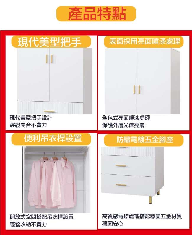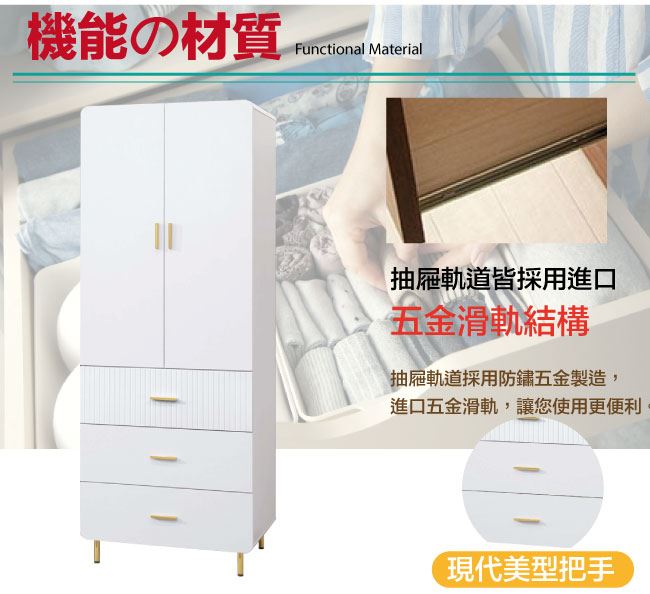 商 品 介 紹 | 【綠家居】培亞輕奢白2.7尺二門三抽衣櫃 輕奢白色系+現代簡約風格+安心材質製造,整體採用防潮MDF板材+防鏽金漆腳座+五金滑軌結構+防夾手緩衝門片五金等安心材質製造,產品外層採用防潮亮面噴漆處理搭配採用開門櫃+吊衣桿+三抽屜+內開放式收納等收納空間設計,全由專人配送到家,專業安心服務,替你省下更多時間! 【商品特色】 輕奢白色系+現代簡約風格+安心材質製造,使用放心+搭配居家更便利 採用防潮MDF板材+防鏽金漆腳座+五金滑軌結構+防夾手緩衝門片五金等安心材質製造 產品外層採用防潮亮面噴漆處理 搭配採用開門櫃+吊衣桿+三抽屜+內開放式收納等收納空間設計 此商品不需要DIY組立,此商品為組立後之成品 品質保證、專業設計、貼心服務 全由專人配送到家,專業安心服務,替您省下更多時間 |