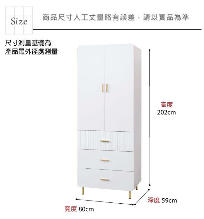 材質 | ◆產品名稱:【綠家居】培亞輕奢白2.7尺二門三抽衣櫃 尺寸:(寬)80x(深)59(高)202/公分 ◆材質: 材質:防潮MDF板材+防鏽金漆腳座+五金滑軌結構+防夾手緩衝門片五金 噴漆:防潮亮面噴漆處理