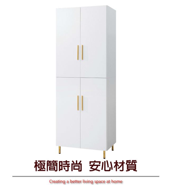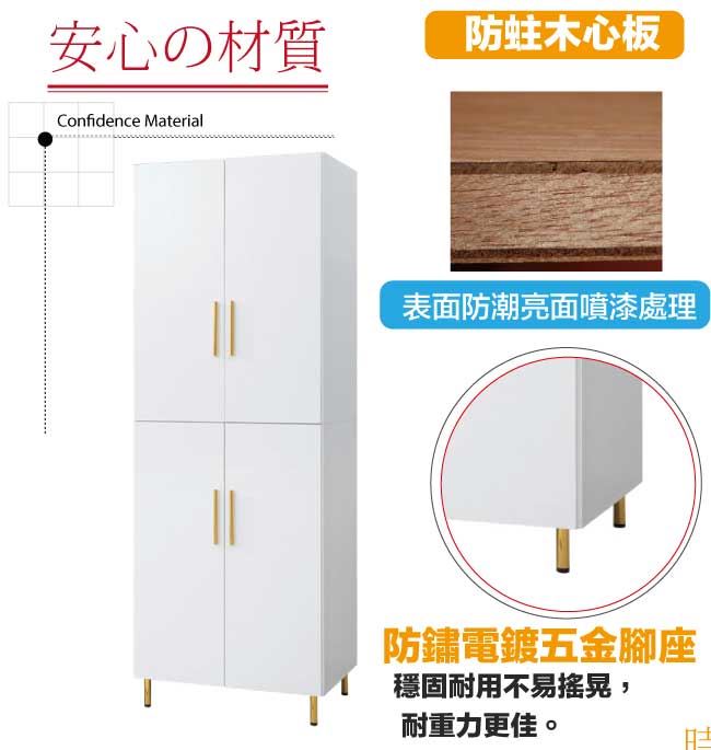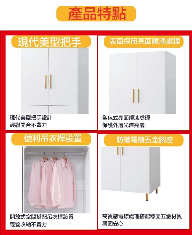 商 品 介 紹 | 【綠家居】溫荷克輕奢白2.5尺四門雙吊衣桿衣櫃 輕奢白色系+現代簡約風格+安心材質製造,整體採用防潮MDF板材+防鏽金漆腳座+防夾手緩衝門片五金等安心材質製造,產品外層採用防潮亮面噴漆處理搭配採用開門櫃+吊衣桿+內開放式收納等收納空間設計,全由專人配送到家,專業安心服務,替你省下更多時間! 【商品特色】 輕奢白色系+現代簡約風格+安心材質製造,使用放心+搭配居家更便利 採用防潮MDF板材+防鏽金漆腳座+防夾手緩衝門片五金等安心材質製造 產品外層採用防潮亮面噴漆處理 搭配採用開門櫃+吊衣桿+內開放式收納等收納空間設計 此商品不需要DIY組立,此商品為組立後之成品 品質保證、專業設計、貼心服務 全由專人配送到家,專業安心服務,替您省下更多時間 |