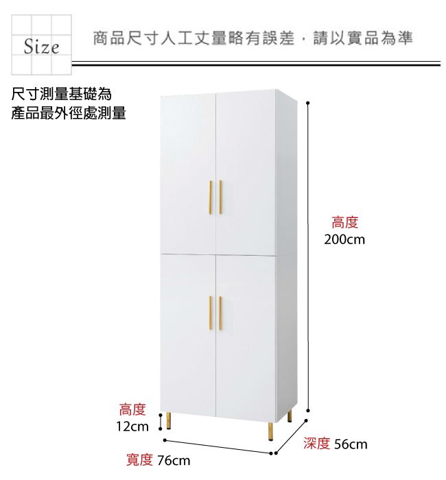 材質 | ◆產品名稱:【綠家居】溫荷克輕奢白2.5尺四門雙吊衣桿衣櫃 尺寸:(寬)76x(深)56(高)200/公分 ◆材質: 材質:防潮MDF板材+防鏽金漆腳座+防夾手緩衝門片五金 噴漆:防潮亮面噴漆處理