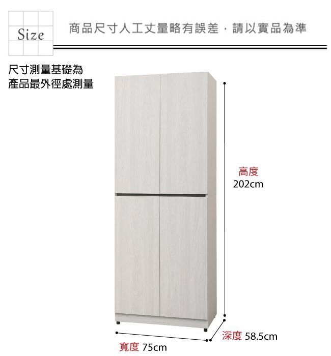 材質 | ◆產品名稱:【綠家居】剛果2.5尺四門雙吊衣桿衣櫃 尺寸:(寬)75x(深)58.5(高)202/公分 ◆材質: 材質:防蛀木心板+防潮耐磨腳座+防夾手緩衝門片五金 噴漆:防潮耐磨噴漆處理