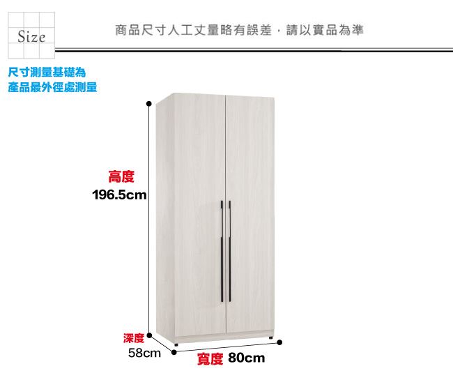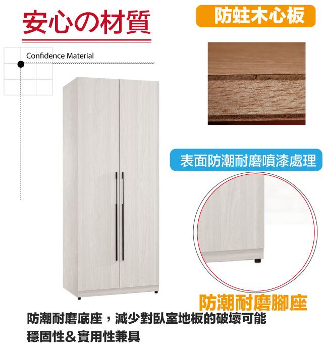 材質 | ◆產品名稱:【綠家居】布沙2.7尺二門雙吊衣櫃/收納櫃 餐櫃尺寸:(寬)80x(深)58(高)196.5公分 ◆材質: 材質:防蛀木心板+防潮耐磨腳座+防夾手緩衝門片五金 噴漆:防潮耐磨噴漆處理