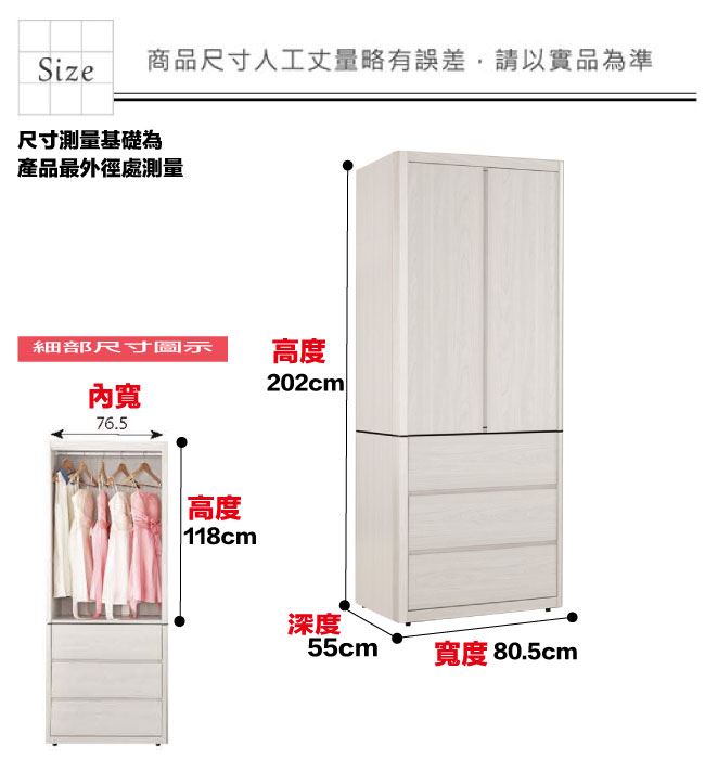 材質 | ◆產品名稱:【綠家居】卡摩帝2.7尺二門三抽衣櫃/收納櫃 尺寸:(寬)80.5x(深)55(高)202公分 ◆材質: 材質:防蛀木心板+防潮耐磨腳座+防夾手緩衝門片五金+五金滑軌結構 噴漆:防潮耐磨噴漆處理