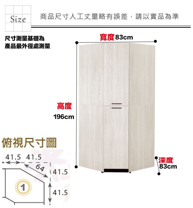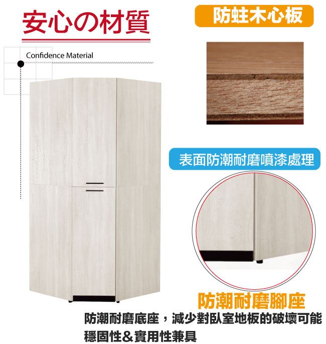 材質 | ◆產品名稱:【綠家居】艾絲莉2.8尺二門轉角衣櫃/收納櫃 尺寸:(寬)83(深)83(高)196公分 ◆材質: 材質:防蛀木心板+防潮耐磨腳座+防夾手緩衝門片五金 噴漆:防潮耐磨噴漆處理