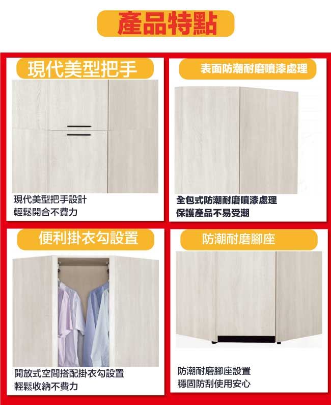 商 品 介 紹 | 【綠家居】艾絲莉2.8尺二門轉角衣櫃/收納櫃 淺橡木紋色系+現代簡約風格+安心材質製造,整體採用防蛀木心板+防潮耐磨腳座+防夾手緩衝門片五金等安心材質製造,產品外層採用防潮耐磨噴漆處理搭配採用開門櫃+內置掛衣勾+內開放式層格等收納空間設計,全由專人配送到家,專業安心服務,替你省下更多時間! 【商品特色】 淺橡木紋色系+現代簡約風格+安心材質製造,使用放心+搭配居家更便利 採用防蛀木心板+防潮耐磨腳座+防夾手緩衝門片五金等安心材質製造 產品外層採用防潮耐磨噴漆處理 採用開門櫃+內置掛衣勾+內開放式層格等收納空間設計 此商品不需要DIY組立,此商品為組立後之成品 品質保證、專業設計、貼心服務 全由專人配送到家,專業安心服務,替您省下更多時間 |