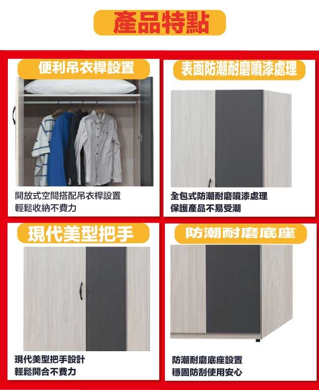 商 品 介 紹 | 【綠家居】卡戴珊雙色2.6尺二門內單吊衣櫃 木紋雙色系+現代簡約風格+安心材質製造,使用放心+搭配居家更便利,整體採用防蛀木心板+防潮耐磨底座+防夾手緩衝門片五金等安心材質製造搭配外層採用優莉坦耐磨全包式噴漆處理 ,採用開門櫃+吊衣桿+內開放層格等收納空間設計,全由專人配送到家,專業安心服務,替你省下更多時間! 【商品特色】 木紋雙色系+現代簡約風格+安心材質製造,使用放心+搭配居家更便利 防蛀木心板+防潮耐磨底座+防夾手緩衝門片五金等安心材質製造 採用開門櫃+吊衣桿+內開放層格等收納空間設計 此商品不需要DIY組立,此商品為組立後之成品 品質保證、專業設計、貼心服務 全由專人配送到家,專業安心服務,替您省下更多時間