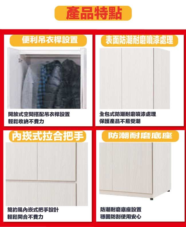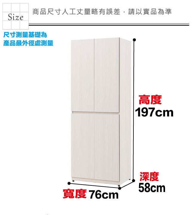 材質 | ◆產品名稱:【綠家居】萊迪2.5尺四門內雙吊衣櫃 尺寸:(寬)76x(深)58x(高)197/公分 ◆材質: 材質:防蛀木心板+防潮耐磨底座+防夾手緩衝門片五金 噴漆:防潮耐磨噴漆處理 |