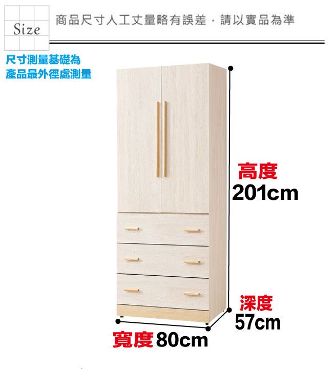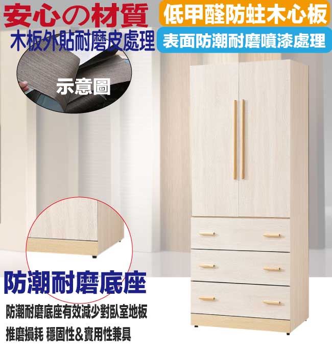 材質 | ◆產品名稱:【綠家居】莎蘿2.7尺二門三抽衣櫃 尺寸:(寬)80x(深)57x(高)201/公分 ◆材質: 材質:防蛀木心板+防潮耐磨底座+防夾手緩衝門片五金+五金滑軌結構 噴漆:防潮耐磨噴漆處理 |