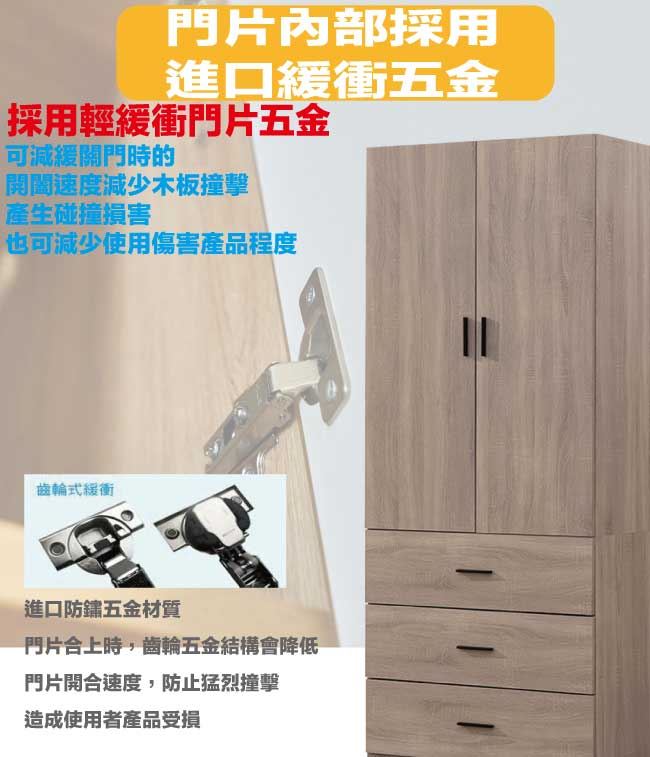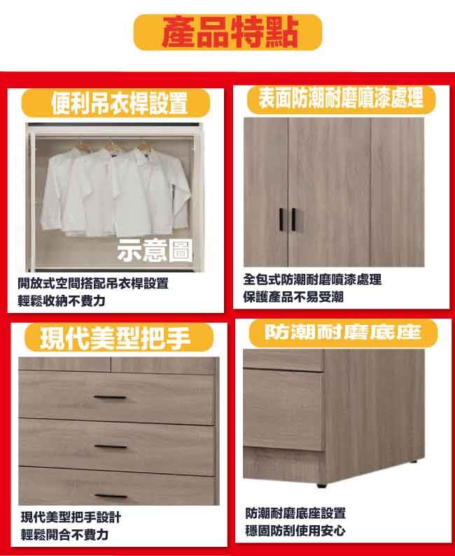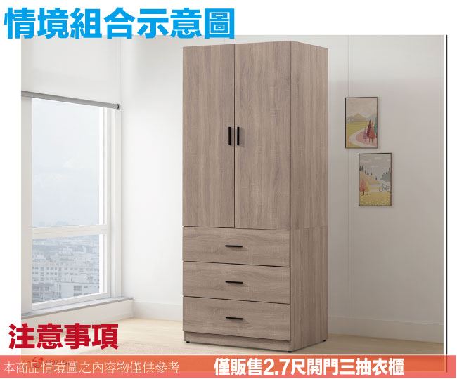 商 品 介 紹 | 【綠家居】迪羅克2.7尺二門三抽衣櫃 灰橡木紋色系+現代簡約風格+安心材質製造,使用放心+搭配居家更便利,整體採用防蛀木心板+防潮耐磨底座+五金滑軌結構+防夾手緩衝門片五金等安心材質製造搭配外層採用優莉坦耐磨全包式噴漆處理 ,採用開門櫃+吊衣桿+三抽屜+內開放層格等收納空間設計,全由專人配送到家,專業安心服務,替你省下更多時間! 【商品特色】 灰橡木紋色系+現代簡約風格+安心材質製造,使用放心+搭配居家更便利 防蛀木心板+防潮耐磨底座+五金滑軌結構+防夾手緩衝門片五金等安心材質製造 採用開門櫃+吊衣桿+三抽屜+內開放層格等收納空間設計 此商品不需要DIY組立,此商品為組立後之成品 品質保證、專業設計、貼心服務 全由專人配送到家,專業安心服務,替您省下更多時間