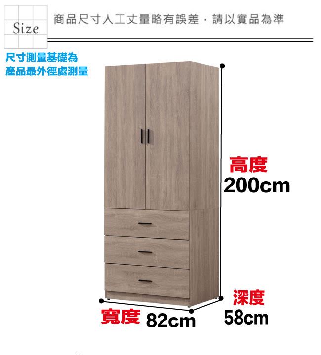 材質 | ◆產品名稱:【綠家居】迪羅克2.7尺二門三抽衣櫃 尺寸:(寬)82x(深)58x(高)200/公分 ◆材質: 材質:防蛀木心板+防潮耐磨底座+五金滑軌結構+防夾手緩衝門片五金 噴漆:防潮耐磨噴漆處理 |
