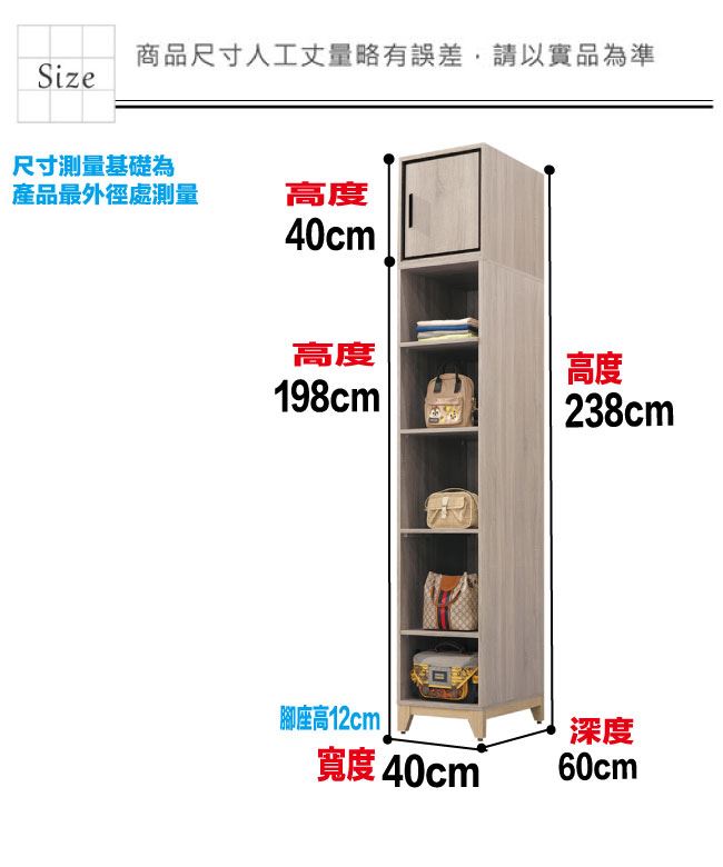 材質 | ◆產品名稱:【綠家居】悅卡1.3尺單開門多格加高衣櫃組合(二色可選) 尺寸:(寬)40x(深)60x(高)238/公分 ◆材質: 材質:防蛀木心板+防潮耐磨底座 噴漆:防潮耐磨噴漆處理 |