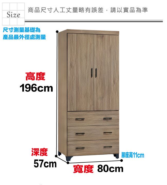 材質 | ◆產品名稱:【綠家居】迪桑2.7尺二門三抽衣櫃 尺寸:(寬)80x(深)57x(高)196/公分 ◆材質: 材質:防蛀木心板+防潮黑漆底座+五金滑軌結構+防夾手緩衝門片五金 噴漆:防潮耐磨噴漆處理 |