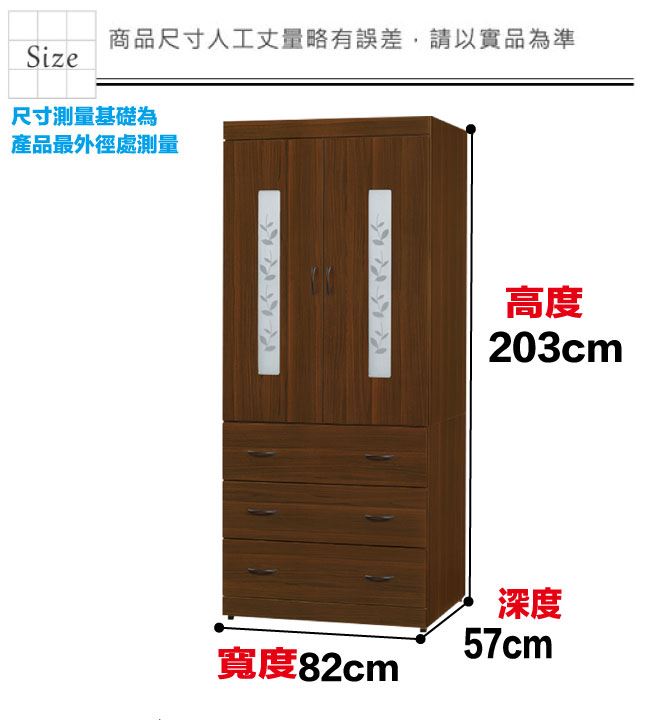 材質 | ◆產品名稱:【綠家居】桑亞2.7尺二門三抽衣櫃 尺寸:(寬)82x(深)57x(高)203/公分 ◆材質: 材質:防蛀木心板+防潮耐磨底座+五金滑軌結構 噴漆:防潮耐磨噴漆處理 |