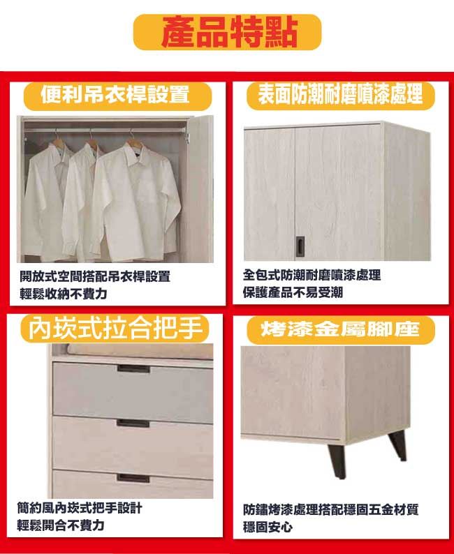 商 品 介 紹 | 【綠家居】達斯2.7尺二門三抽衣櫃 木紋雙色系+現代簡約風格+安心材質製造,使用放心+搭配居家更便利,整體採用防蛀木心板+烤漆金屬腳座+五金滑軌結構+防夾手緩衝門片五金等材質搭配外層採用防潮耐磨噴漆處理,採用開門櫃+吊衣桿+三抽屜+內開放式層格等收納空間設計,全由專人配送到家,專業安心服務,替你省下更多時間! 【商品特色】 木紋雙色系+現代簡約風格+安心材質製造,使用放心+搭配居家更便利 防蛀木心板+五金滑軌結構+烤漆金屬腳座+防夾手緩衝門片五金等材質製造 採用開門櫃+吊衣桿+三抽屜+內開放式層格等收納空間設計 此商品不需要DIY組立,此商品為組立後之成品 品質保證、專業設計、貼心服務 全由專人配送到家,專業安心服務,替您省下更多時間