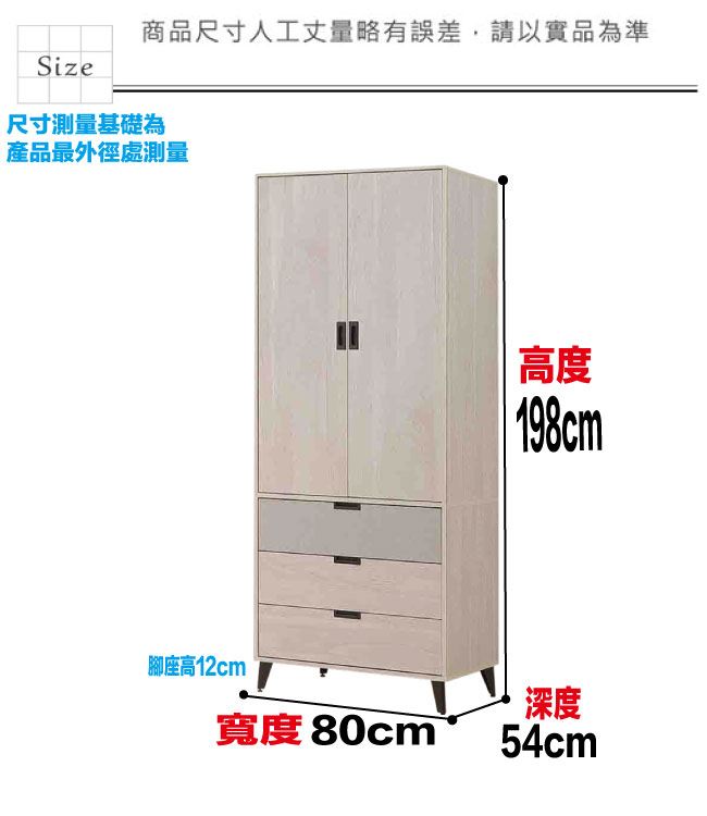材質 | ◆產品名稱:【綠家居】達斯2.7尺二門三抽衣櫃 尺寸:(寬)80x(深)54(高)198/公分 ◆材質: 材質:防蛀木心板+五金滑軌結構+烤漆金屬腳座+防夾手緩衝門片五金 噴漆:防潮耐磨噴漆處理 |