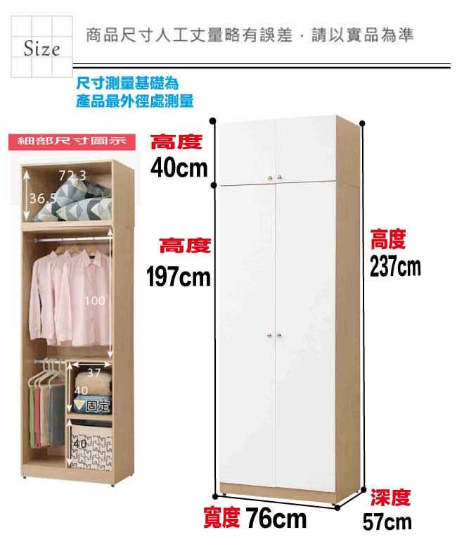 材質 | ◆產品名稱:【綠家居】愛坦雙色2.5尺四門內多格加高衣櫃組合 尺寸:(寬)76x(深)57(高)237/公分 ◆材質: 材質:防蛀木心板+防潮耐磨腳座+白色面板採用皮革紋路貼皮處理+防夾手緩衝門片五金 噴漆:防潮耐磨噴漆處理 |