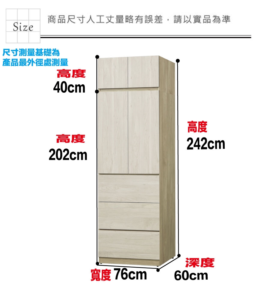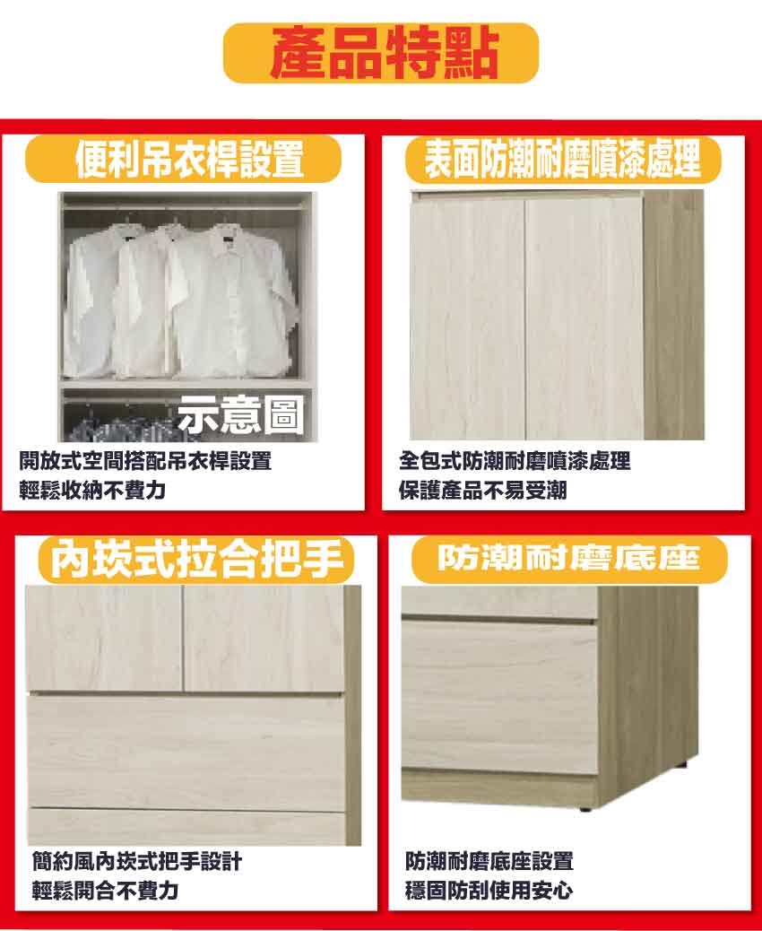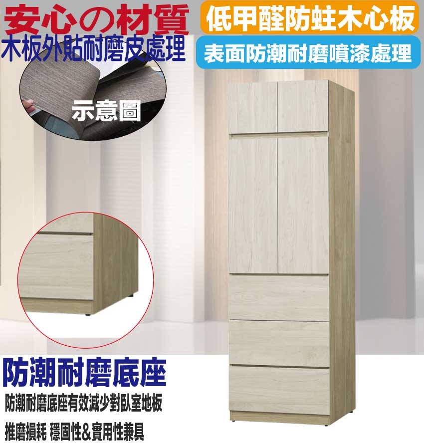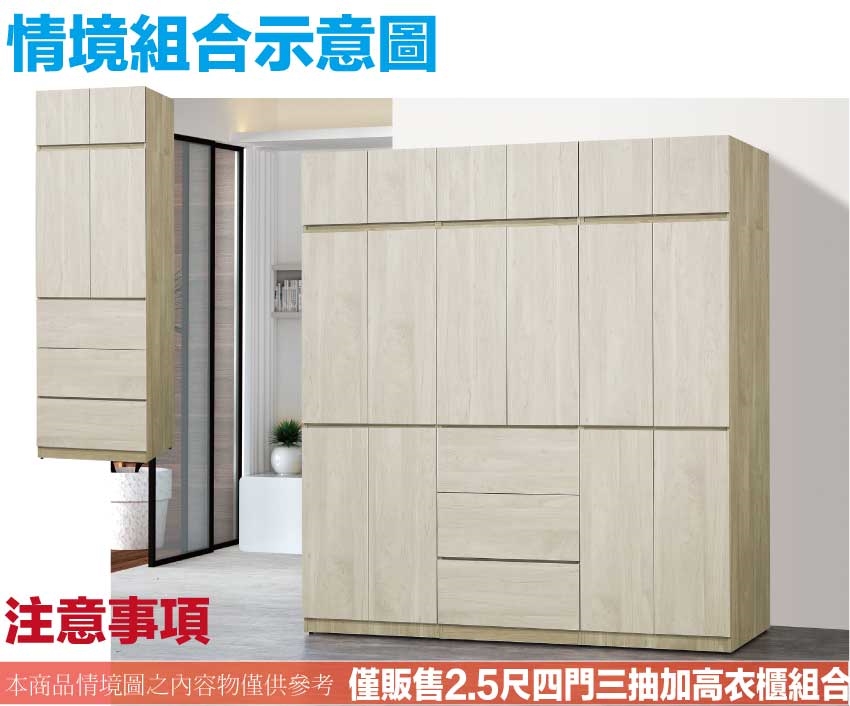 - ◆產品名稱:【綠家居】瑞歐雙色2.5尺四門三抽加高衣櫃組合