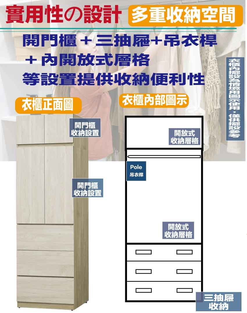 搭配開門櫃+吊衣桿+三抽屜+內開放層格等收納空間設計