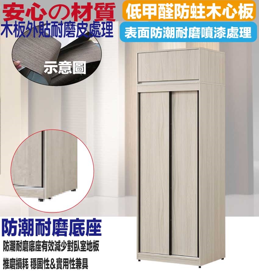 ★偏遠地區需額外加收運費,下標請先問與答詢問★ ★下訂前注意 由於商品流動較快,下訂前請先詢問是否有貨在下訂喔~★ 【綠家居】希望2.7尺開&推門加高衣櫃組合 淺橡木紋色系+安心材質製造,使用放心+搭配居家更便利,採用防蛀木心板+防潮耐磨底座+防夾手緩衝五金等安心材質製造 ,外層採用防潮耐磨噴漆處理搭配採用開門櫃&推門櫃+吊衣桿+內開放層格等收納空間設計,全由專人配送到家,專業安心服務,替你省下更多時間!