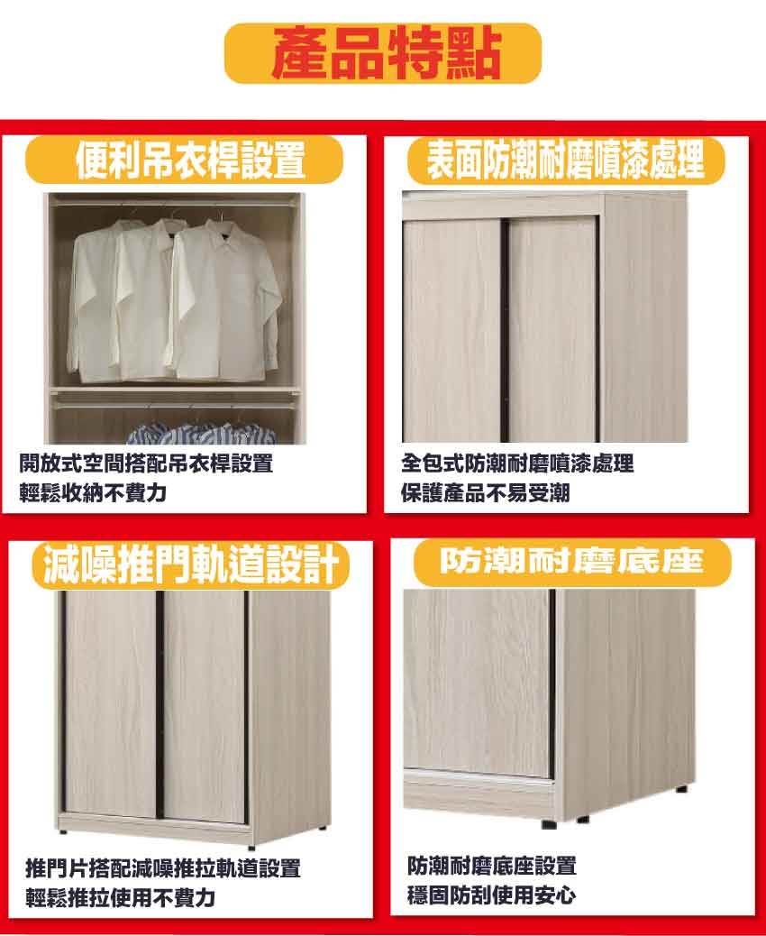 ★偏遠地區需額外加收運費,下標請先問與答詢問★ ★下訂前注意 由於商品流動較快,下訂前請先詢問是否有貨在下訂喔~★ 【綠家居】希望2.7尺推門衣櫃 淺橡木紋色系+安心材質製造,使用放心+搭配居家更便利,採用防蛀木心板+防潮耐磨底座等安心材質製造 ,外層採用防潮耐磨噴漆處理搭配採用推門櫃+吊衣桿+內開放層格等收納空間設計,全由專人配送到家,專業安心服務,替你省下更多時間!