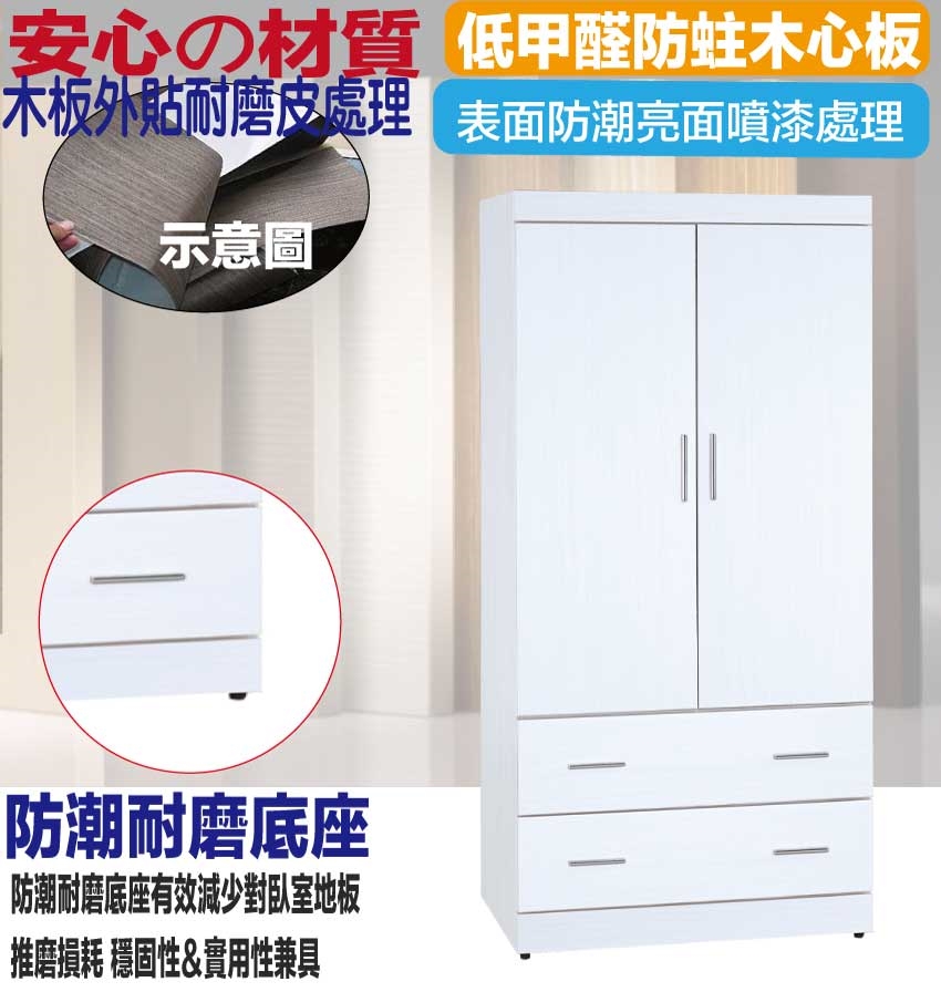 ★偏遠地區需額外加收運費,下標請先問與答詢問★ ★下訂前注意 由於商品流動較快,下訂前請先詢問是否有貨在下訂喔~★ 【綠家居】卡蒂柏2.7尺二門二抽衣櫃 現代白色系+安心材質製造,使用放心+搭配居家更便利,採用防蛀木心板+防潮耐磨底座+五金滑軌結構+防夾手緩衝門片五金等安心材質製造 ,外層採用防潮亮面噴漆處理搭配採用開門櫃+吊衣桿+二抽屜+內開放式層格等收納空間設計,全由專人配送到家,專業安心服務,替你省下更多時間!