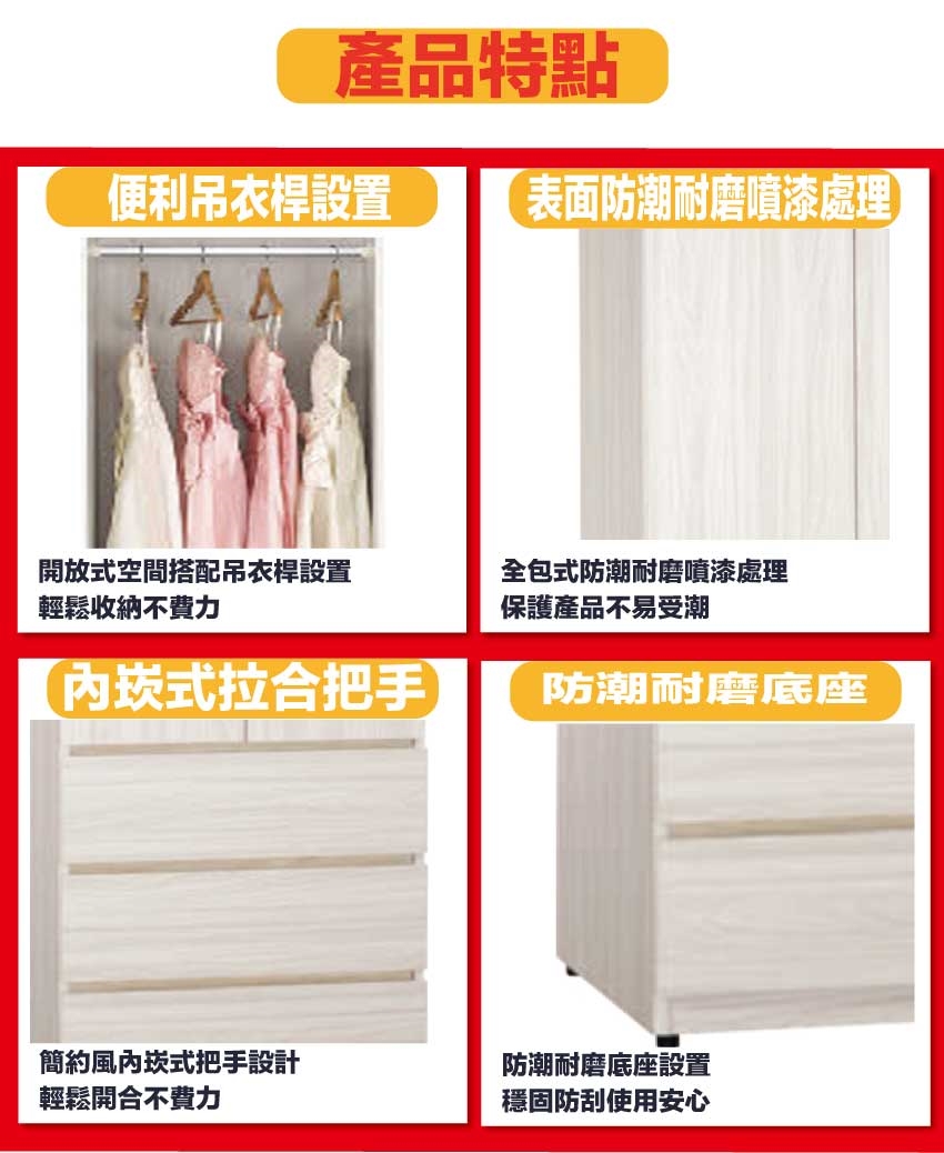 採用防蛀木心板+防潮耐磨底座+防夾手緩衝門片五金+五金滑軌結構等安心材質製造
