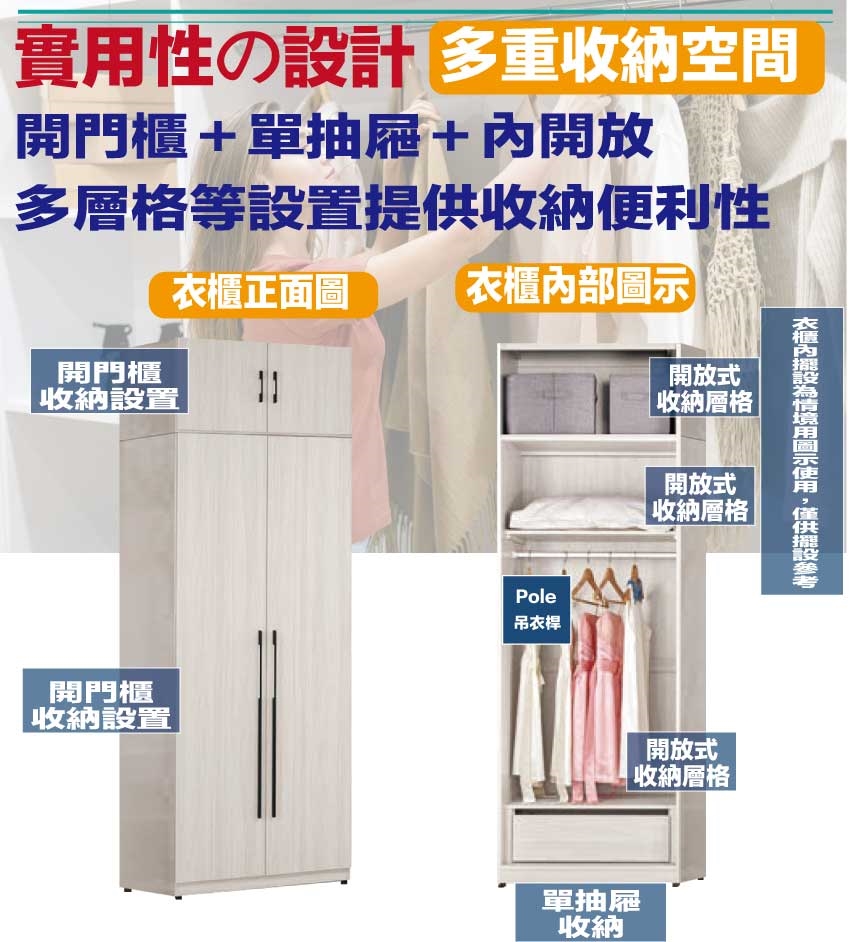 搭配採用開門櫃+吊衣桿+單抽屜+內開放層格等收納空間設計