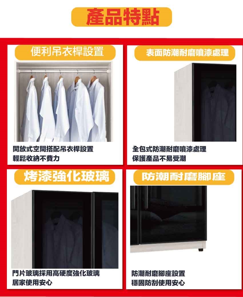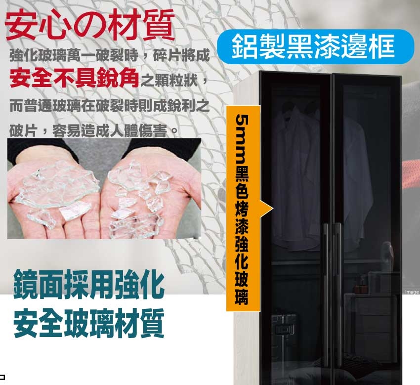 採用防蛀木心板+防潮耐磨底座+防夾手緩衝門片五金+鋁製黑漆邊框+5mm強化黑玻璃等安心材質製造