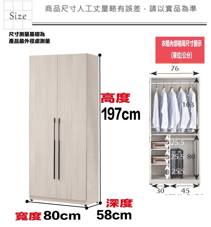 尺寸:(寬)80x(深)58x(高)197/公分 ◆材質: 材質:防蛀木心板+防潮耐磨腳座+防夾手緩衝門片五金 噴漆:防潮耐磨噴漆處理 ◎注意事項: 1.接單後,會有專員與您電聯確認送貨時間。 2.需以吊車吊運以當地吊車行情計,費用由消費者支付。 3.備註:本商品不含圖片上、家飾...等,情境圖之內容僅供參考。 4.請於配送人員到場時,檢查商品有無缺失,以免造成爭議。 5.允許的誤差尺寸範圍+-2%。 6.因拍攝燈光與電腦解析度瑩幕不同可能會造成實品與網頁上商品有些許色差,商品以收到實品為主。 ◎收貨與退貨: 1.實因特殊地型限制及(山區、濱海鄉、鎮、村、區)無法送貨時,本公司保有出貨與否之權利(下單後會由專人告知是否可配送)。 2.有電梯不收取費用! 無電梯樓層超過4樓以上(包含4樓)一樓層費用200元,現場支付給服務員。 3.超過鑑賞期,恕不接受退貨。 4.限非人為因素破壞毀損,才可退貨。 5.若退貨時,收件時間請與廠商協調,確保自己權益。 6.退貨時應保留贈品及附件完整(如有遺失部分,需酌收費用)。 ◎備註: .無回收服務。 .收貨與退貨:實因特殊地型限制及(山區、濱海鄉、鎮、村、區)無法送貨時,本公司保有出貨與否之權利(下單後會由專人告知是否可配送)。 .花蓮(縣市)、台東(縣市)、屏東(縣市場及其它縣市屬於山區、濱海鄉、鎮、村地區無配送服務,如您有需求,則需另外收取運費。(您可直接訂購,後續由廠商報價。) ※由於加價配送服務為一次消耗性商品,若有退換貨等情形加購之運費恕無法退還 ※運費報價皆為單趟計算。 ※使用加價配送地區,收貨時間會比一般地區再增加10個工作天。