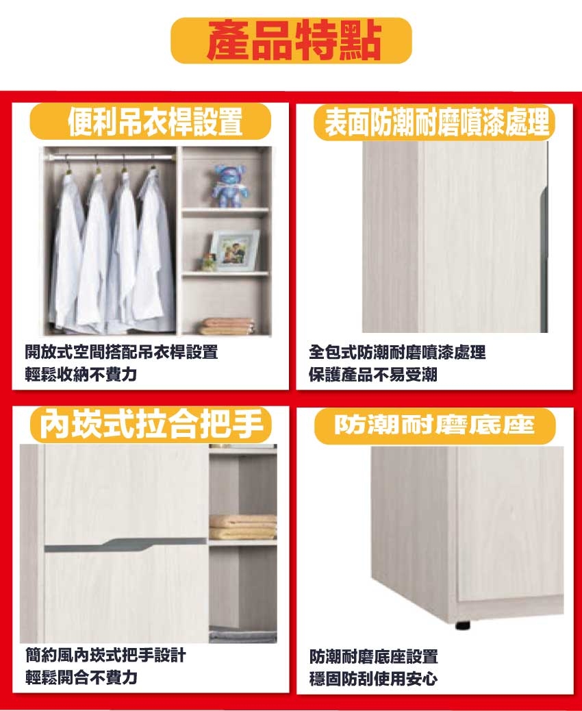 材質:防蛀木心板+防潮耐磨腳座+防夾手緩衝門片五金