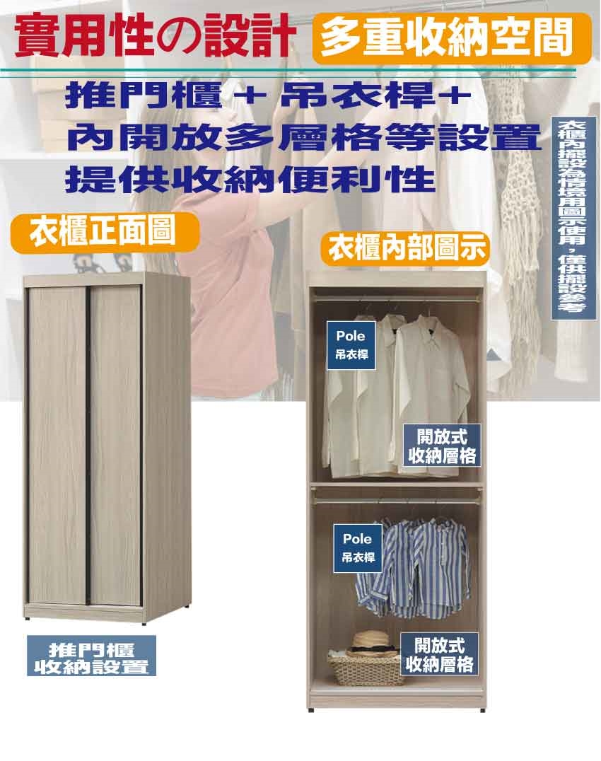 搭配採用推門櫃+吊衣桿+內開放層格等收納空間設計