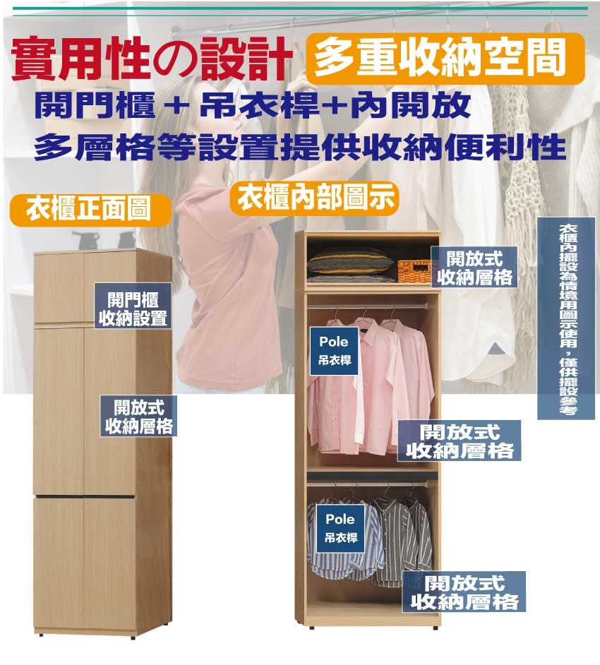 搭配採用開門櫃+吊衣桿+單抽屜+內開放層格等收納空間設計
