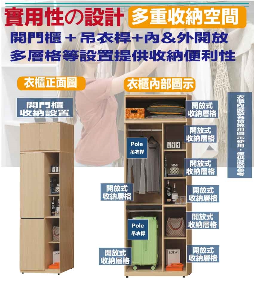 搭配採用開門櫃+吊衣桿+內&外開放層格等收納空間設計