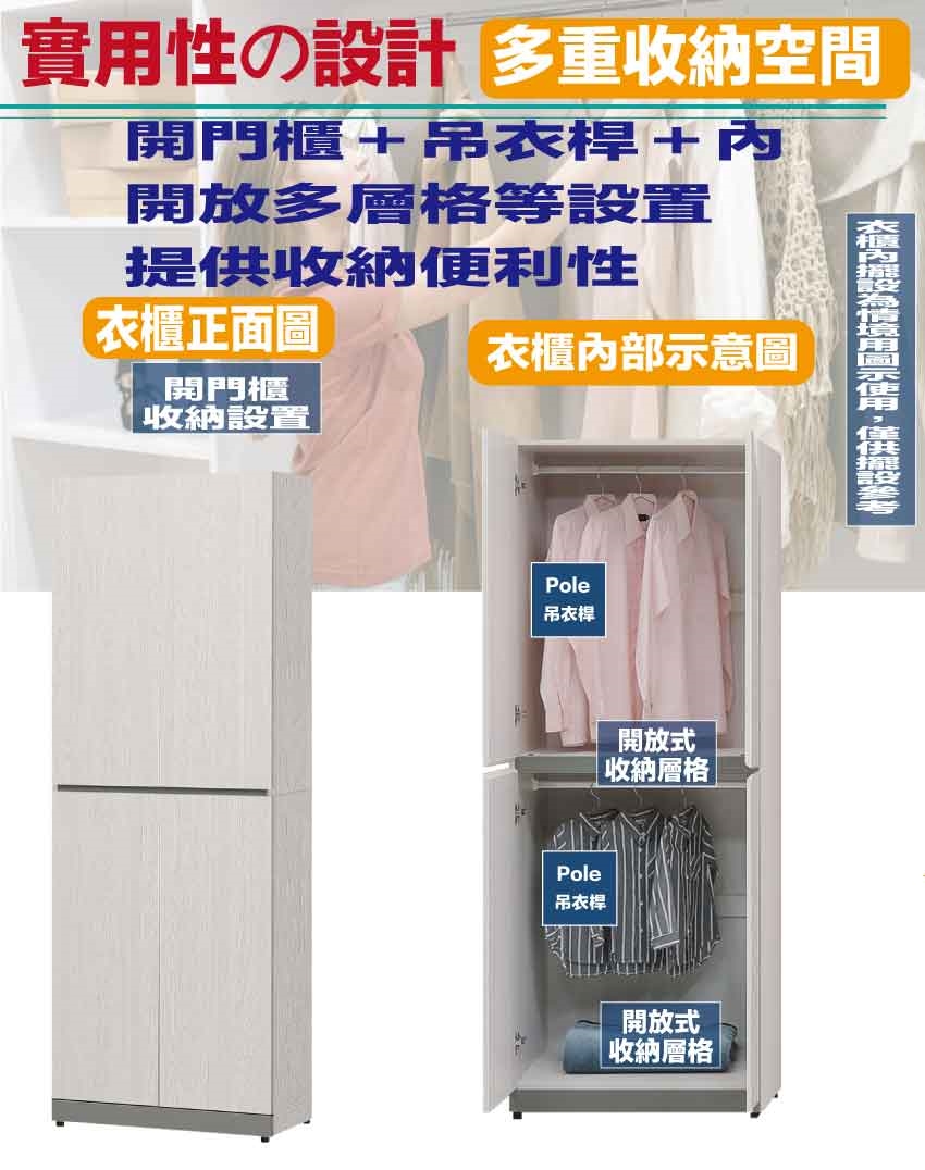 搭配採用開門櫃+吊衣桿+內開放多層格等收納空間設計