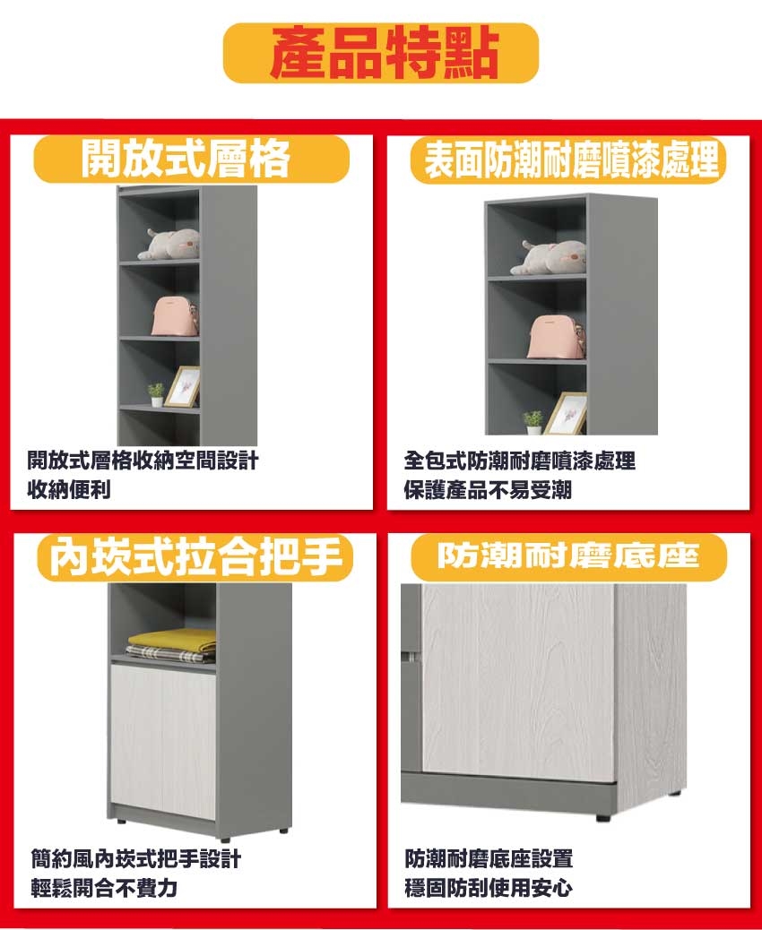 材質:防蛀木心板+防潮耐磨腳座+防夾手緩衝門片五金