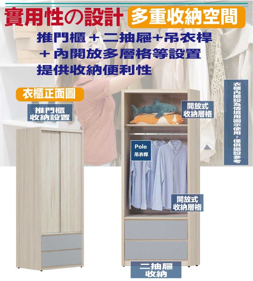 推門櫃+吊衣桿+二抽屜
