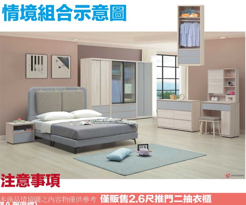 搭配採用推門櫃+吊衣桿+二抽屜+內開放層格等收納空間設計