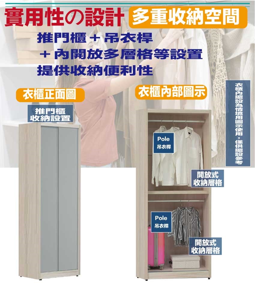 搭配採用推門櫃+吊衣桿+內開放層格等收納空間設計