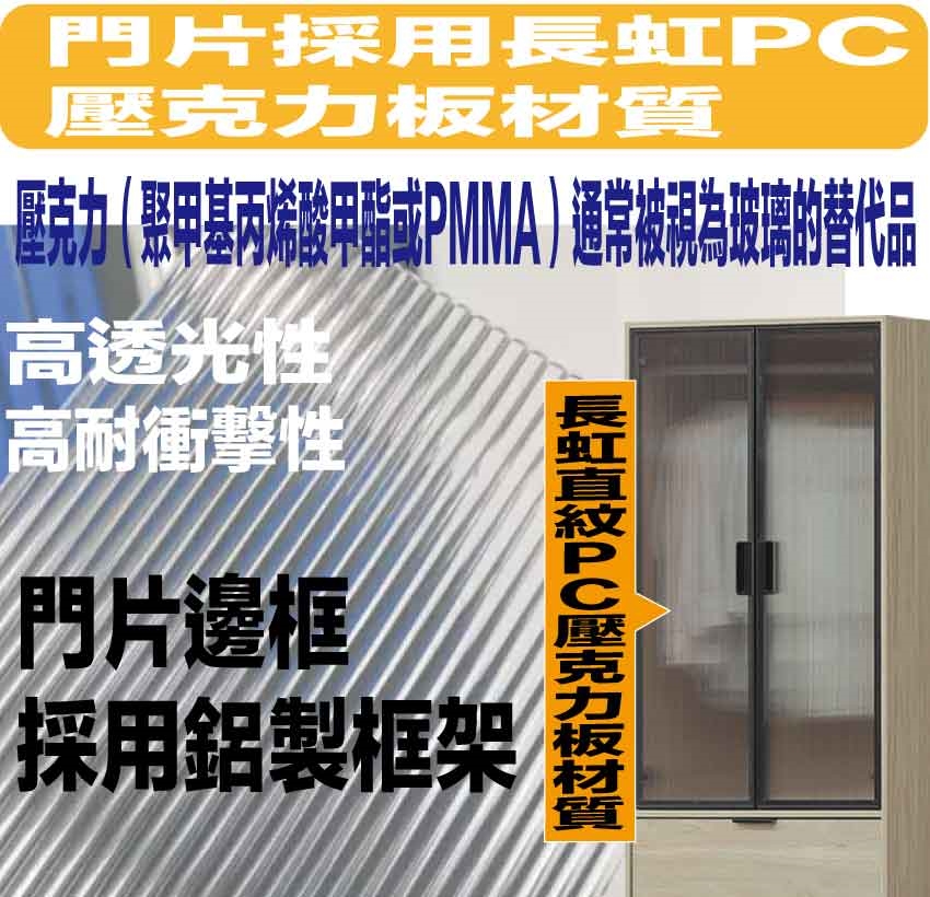 材質:防蛀木心板+防潮耐磨腳座+黑漆鋁製門框+長虹PC材質門片+防夾手緩衝門片五金+五金滑軌結構