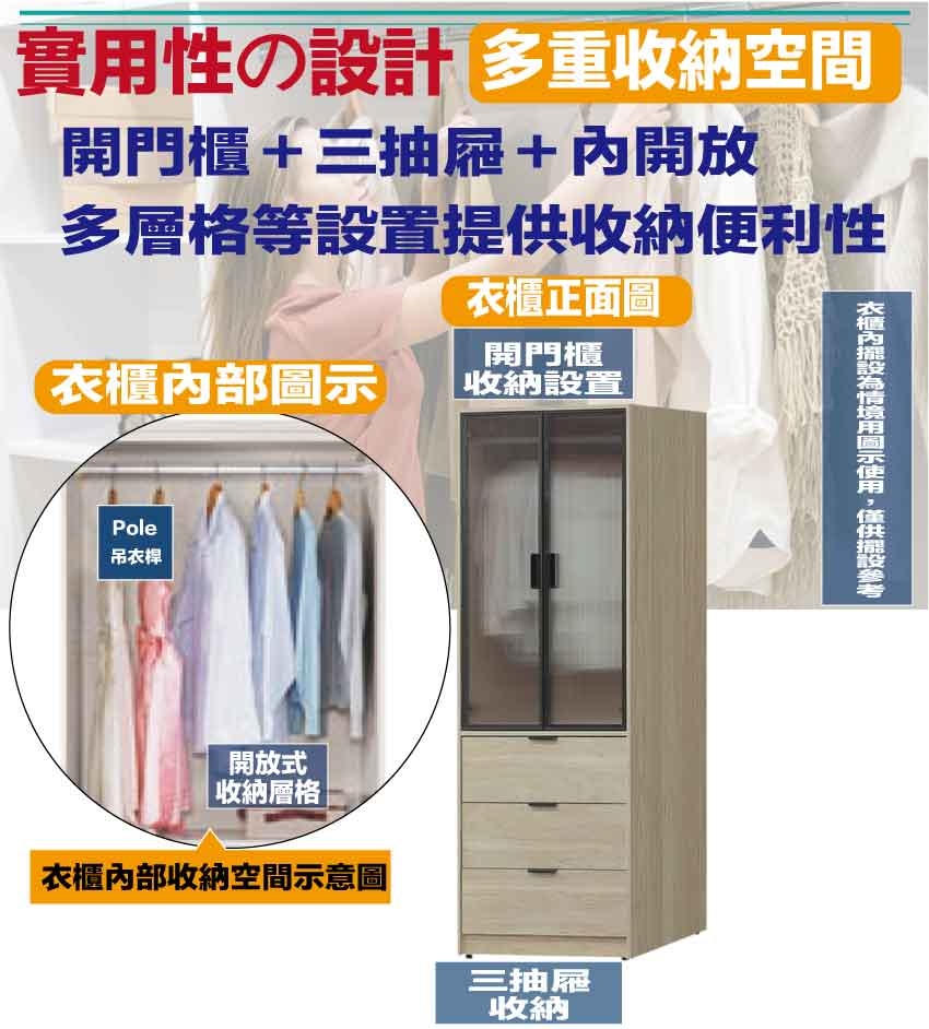 搭配採用開門櫃+吊衣桿+三抽屜+內開放層格等收納空間設計