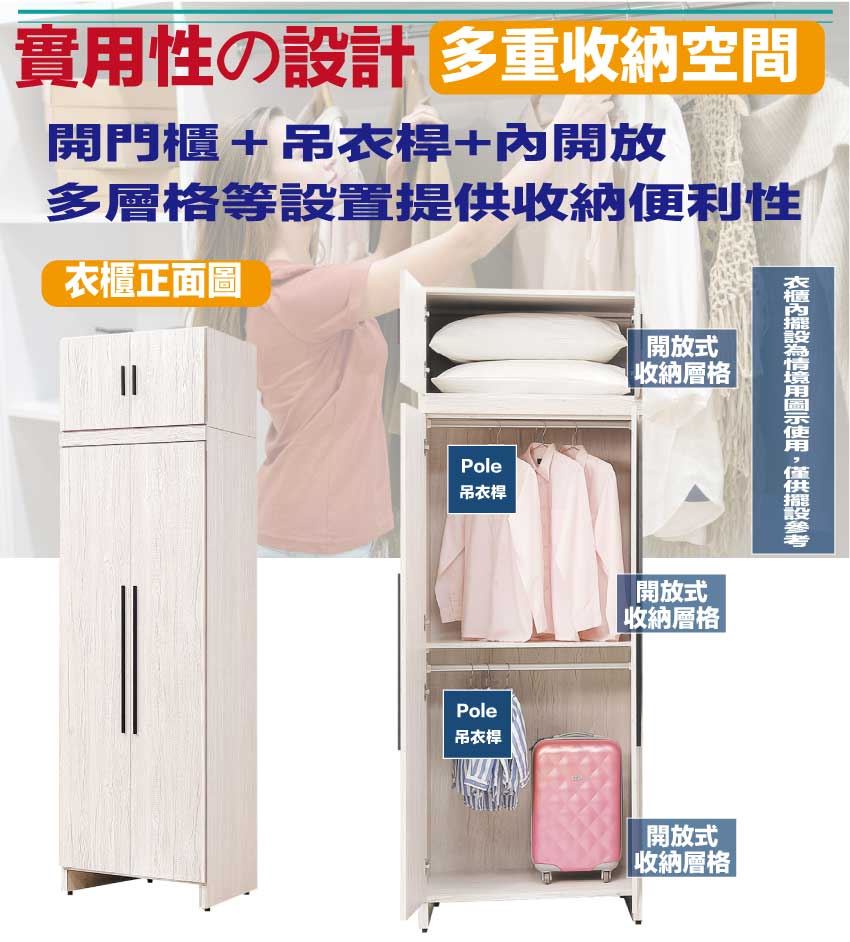 搭配採用開門櫃+吊衣桿+內開放層格等收納空間設計