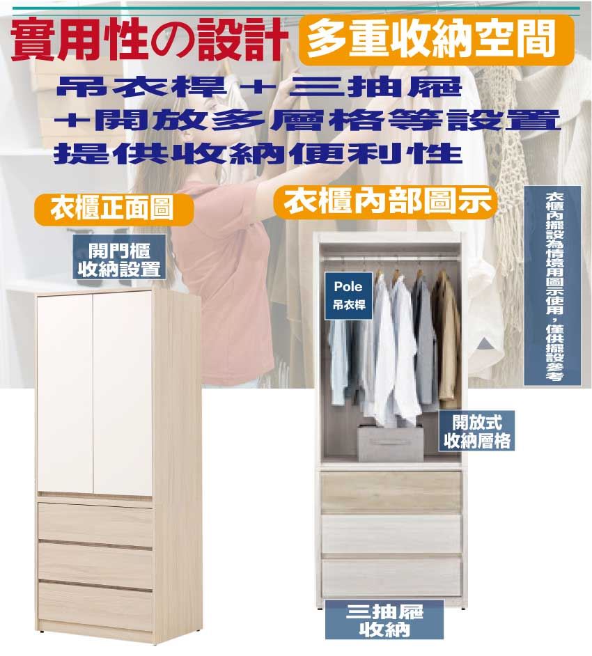 搭配採用開門櫃+吊衣桿+三抽屜+內開放式層格等收納空間設計